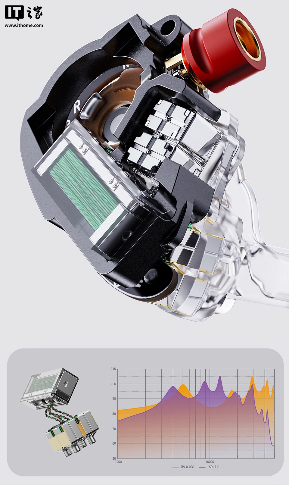 该耳机采用两组美国楼氏复合动铁单元作为中、高频发声单元。其中一组复合单元一分为二,分别负责中频及中高频段,提高中频密度和声音透明度,与静电单元过渡衔接。同时配备定制“中频增强型动铁单元”,动铁后腔部分增设声学透气孔,使中频动铁单元获得了更多的声能储备,提升人声效果。