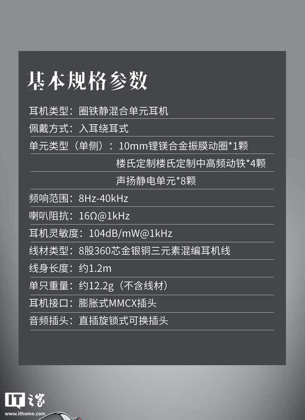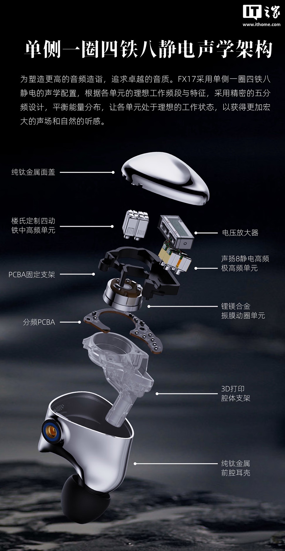 据介绍,这款耳机采用单侧一圈四铁八静电的声学配置,拥有五分频设计,号称可以“平衡能量分布,让各单元处于理想的工作状态,以获得更加宏大的声场和自然的听感”。
