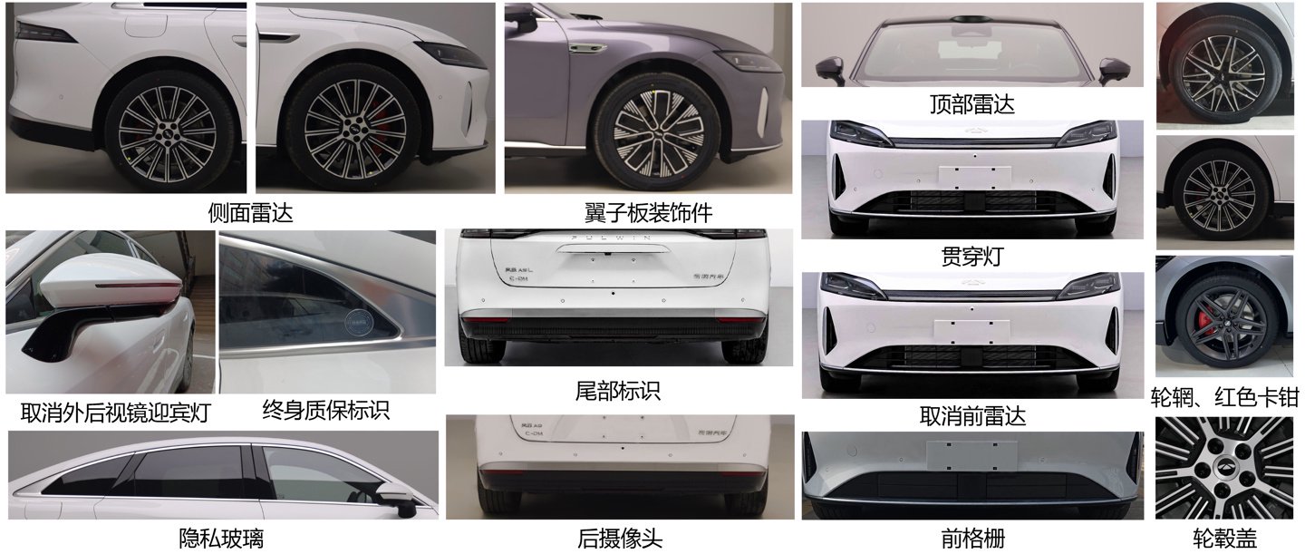 IT之家从申报信息中获悉,该车尺寸为 5018/1965/1500mm,轴距 3000mm,采用 245/50 R19 或 245/45 R20 轮胎。动力方面,新车搭载 1.5L(1499ml)SQRH4J15 发动机,最大净功率 105kW,油耗申报值为 0.52L 或 0.80L / 100km;配备磷酸铁锂电池,最高车速 180km/h。该车还可选装顶部激光雷达、终身质保标识等多种配置,并配备汽车事件数据记录系统 (EDR)。
