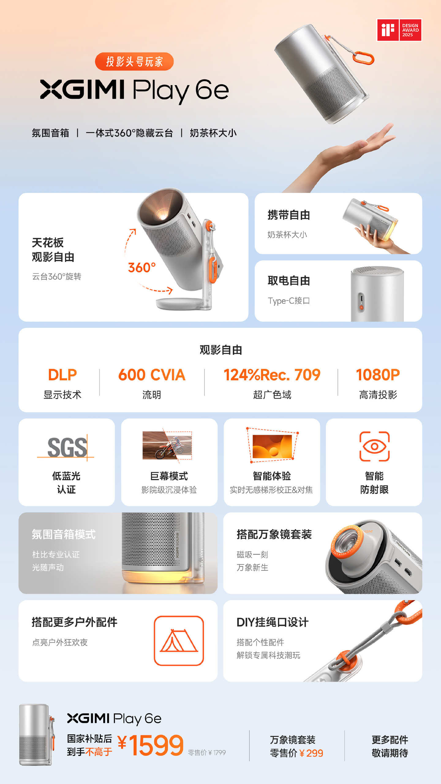 极米 Play 6e 同样配备一体式 360° 隐藏云台、DIY 挂绳口设计,提供 Type-C 接口。氛围音箱模式获得杜比专业认证,支持光随声动。此外,该产品采用 DLP 显示技术,支持 600CVIA 流明、1080P 高清投影、124% Rec.709 广色域、SGS 低蓝光认证、实时无感梯形校正 & 对焦、智能防射眼。