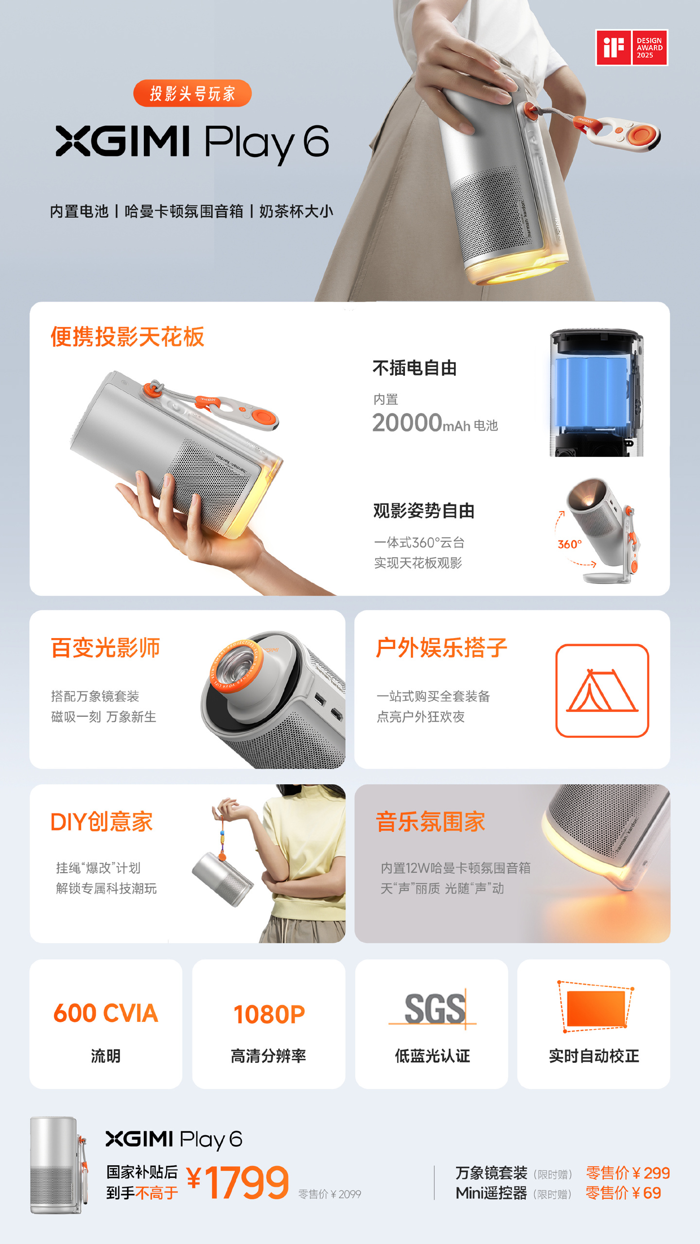 IT之家从官方海报获悉,极米 Play 6 内置 20000mAh 电池,支持不插电使用;内置 12W 哈曼卡顿氛围音箱,据称只有“奶茶杯大小”。此外,该产品还支持 600CVIA 流明、1080P 分辨率、SGS 低蓝光认证、实时自动校正。