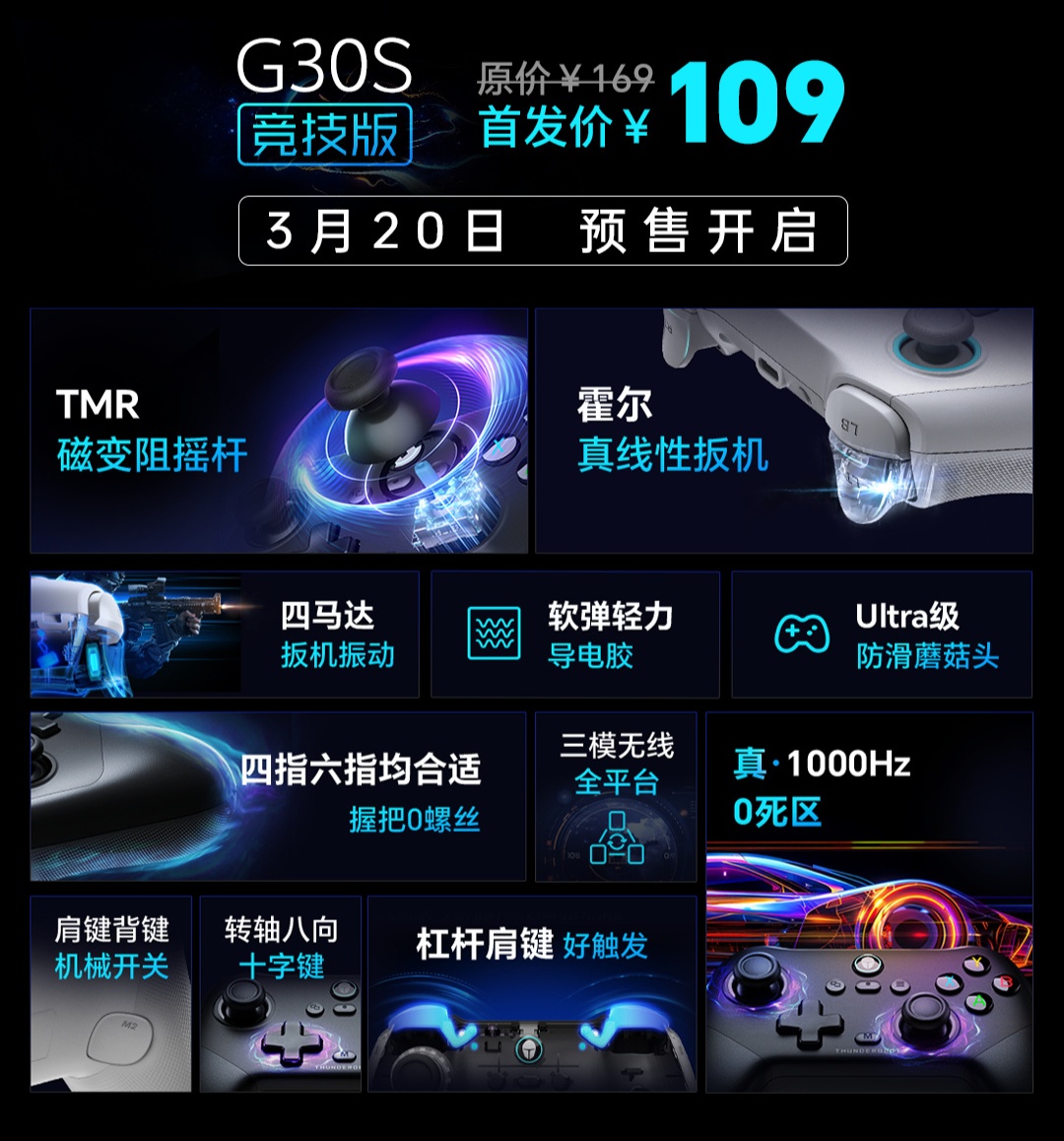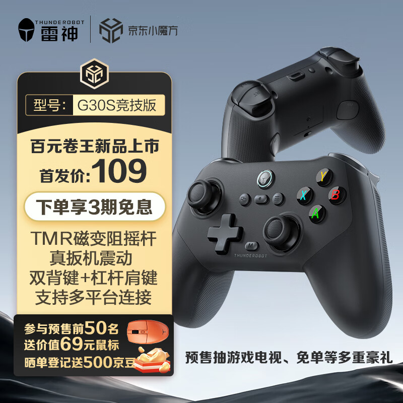 IT之家 3 月 20 日消息,雷神 G30S 竞技版游戏手柄今日开启预售,号称“百元卷王”,首发价 109 元,提供本白灰和黑色两款配色。