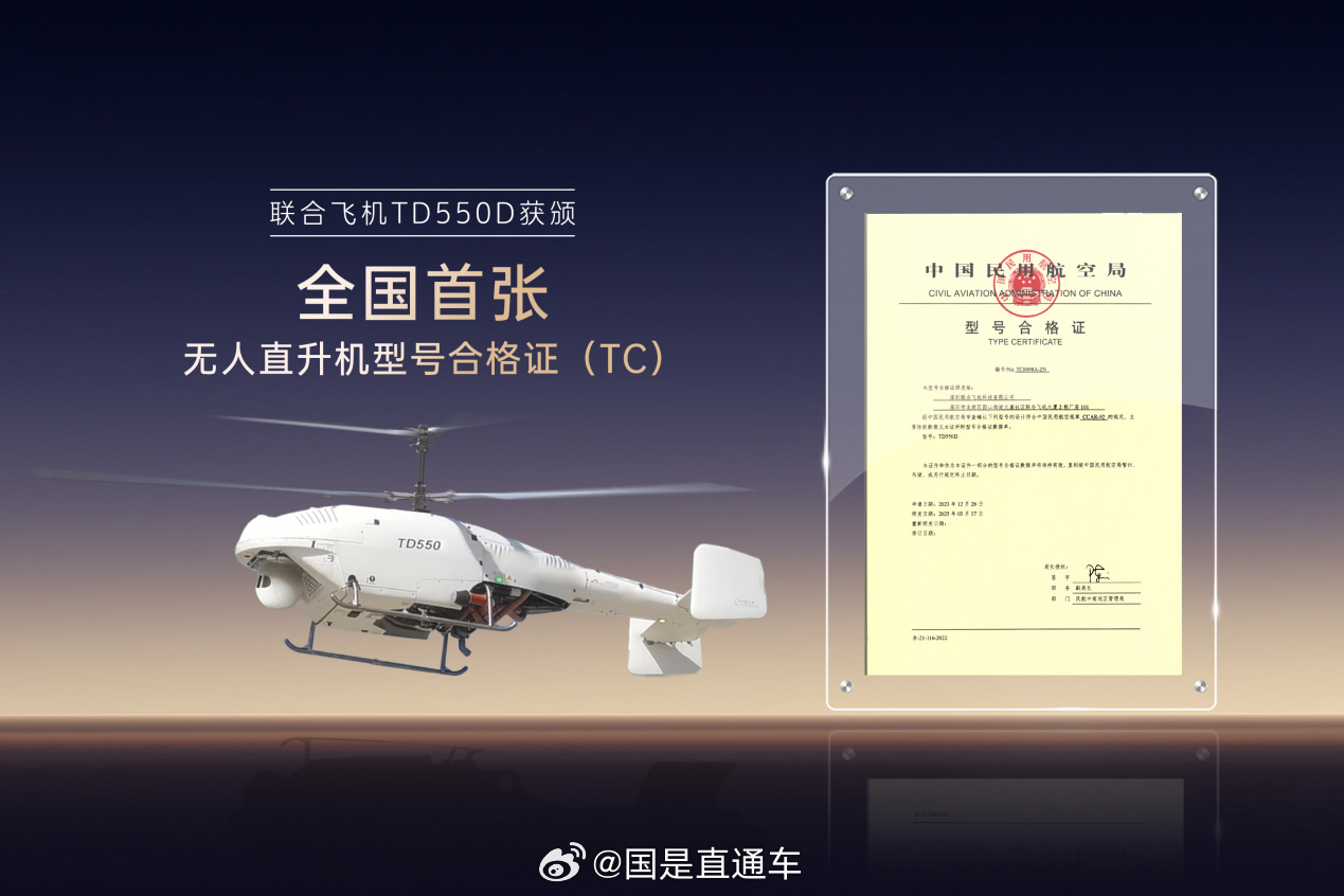 IT之家 3 月 20 日消息,据中新社国是直通车报道,中国民用航空局日前正式授予联合飞机 TD550D 无人直升机系统型号合格证,宣告了全国首款通过适航审定的无人直升机系统诞生。