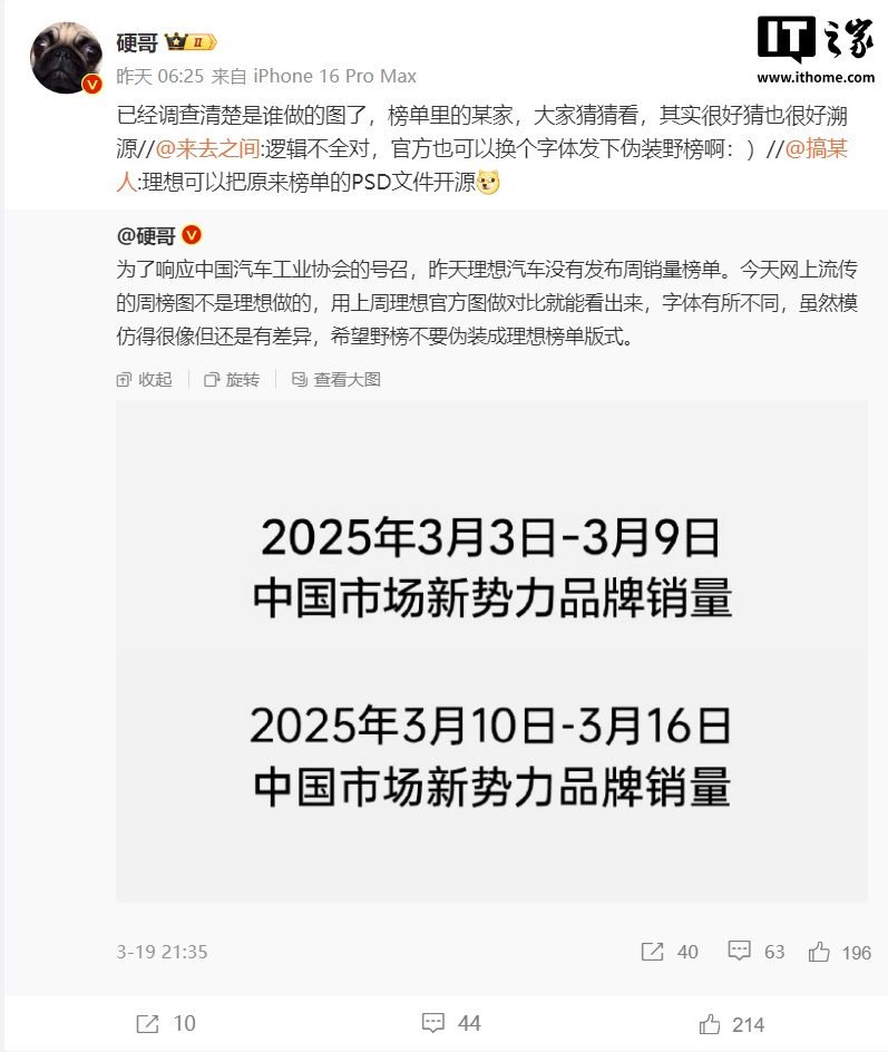 对此,理想汽车高管孙敏杰称,为了响应中国汽车工业协会的号召,理想汽车没有发布周销量榜单。网上流传的周榜图不是理想做的,用上周理想官方图做对比就能看出来,字体有所不同,虽然模仿得很像但还是有差异,希望野榜不要伪装成理想榜单版式。