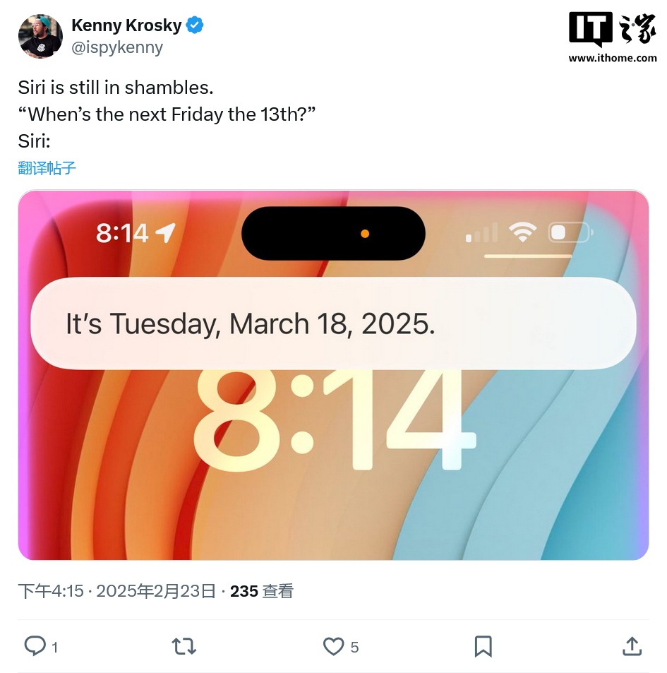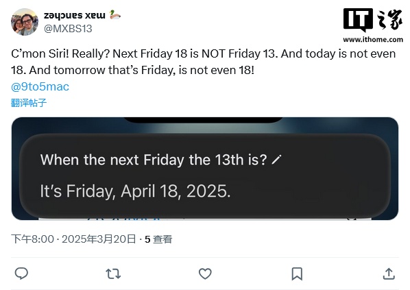 IT之家 3 月 21 日消息,在无法回答“现在几月份?”这个问题后,Siri 再次被曝无法正确计算日期。科技媒体 9to5Mac 昨日(3 月 20 日)发布博文,报道称 Siri 无法回答“下个周五是 13 号的是哪一天?”这个简单问题。