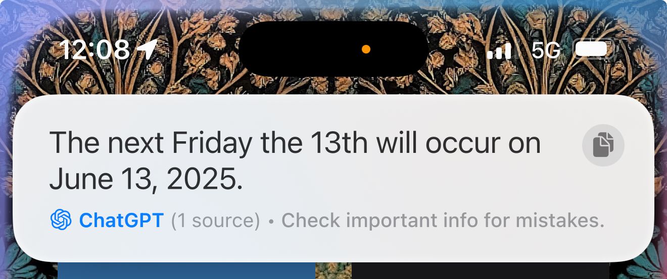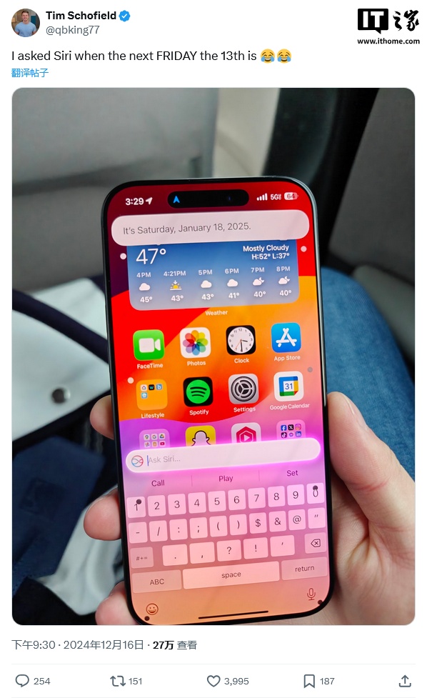 IT之家查询公开资料,即便 Siri 能回答上述问题,返回的结果也是错误的,总是计算为 18 号(可能是将周五的 5 和数字 13 相加计算了):