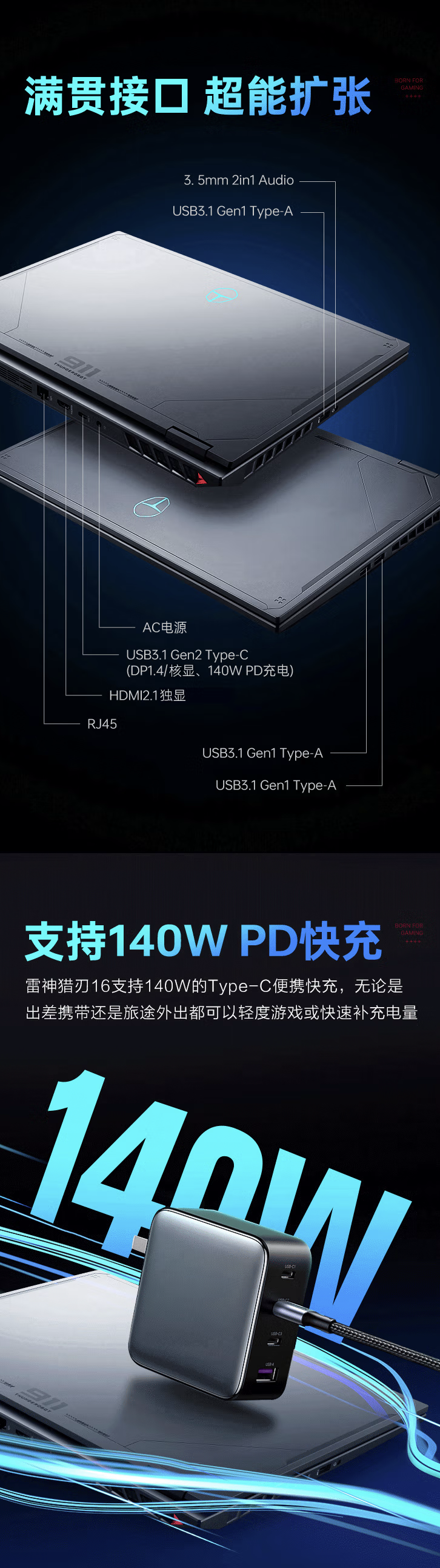 机器左侧配备 1 个 3.5mm 音频接口、1 个 USB-A 3.1 Gen 1 接口;右侧配备 2 个 USB-A 3.1 Gen 1 接口;后侧配备 1 个 RJ45 接口、1 个 HDMI 2.1 接口、1 个 USB-C 3.1 Gen 2 接口。此外,该机支持 140W USB-C PD 快充。