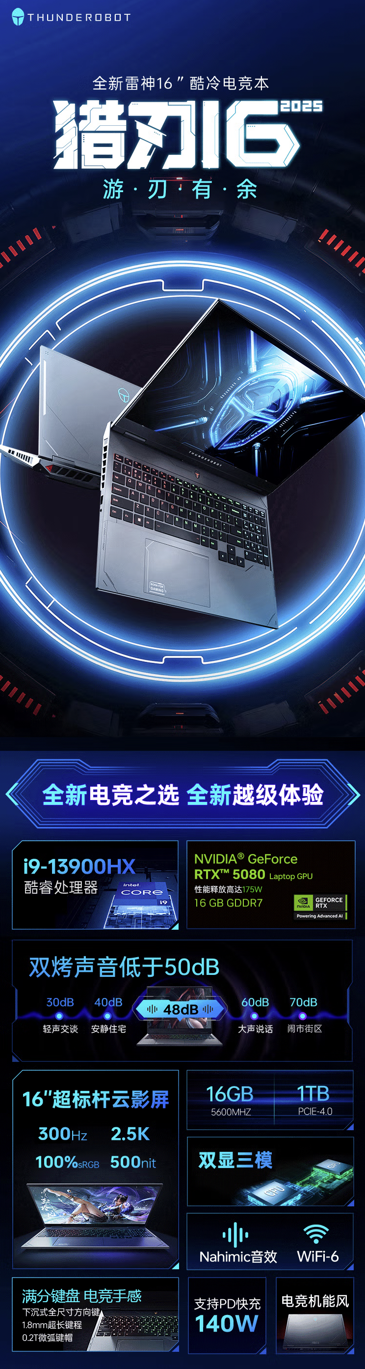 该机搭载英特尔酷睿 i9-13900HX 处理器 + RTX 5080 显卡,配备 16GB DDR5 5600 内存 + 1TB PCIe 4.0 固态硬盘,拥有 230W 性能释放。