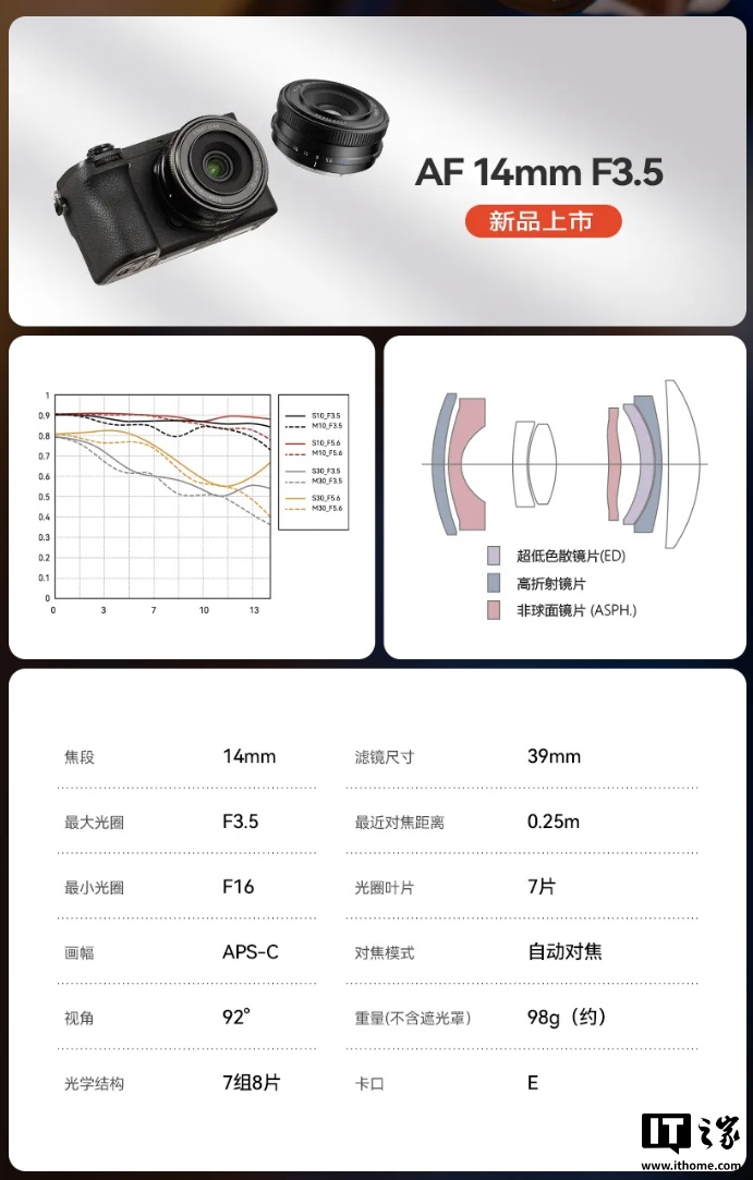 铭匠 AF 14mm F3.5 自动镜头定价 680 元,首发活动价 610 元,今日 18:00 上市,IT之家附参数表如下: