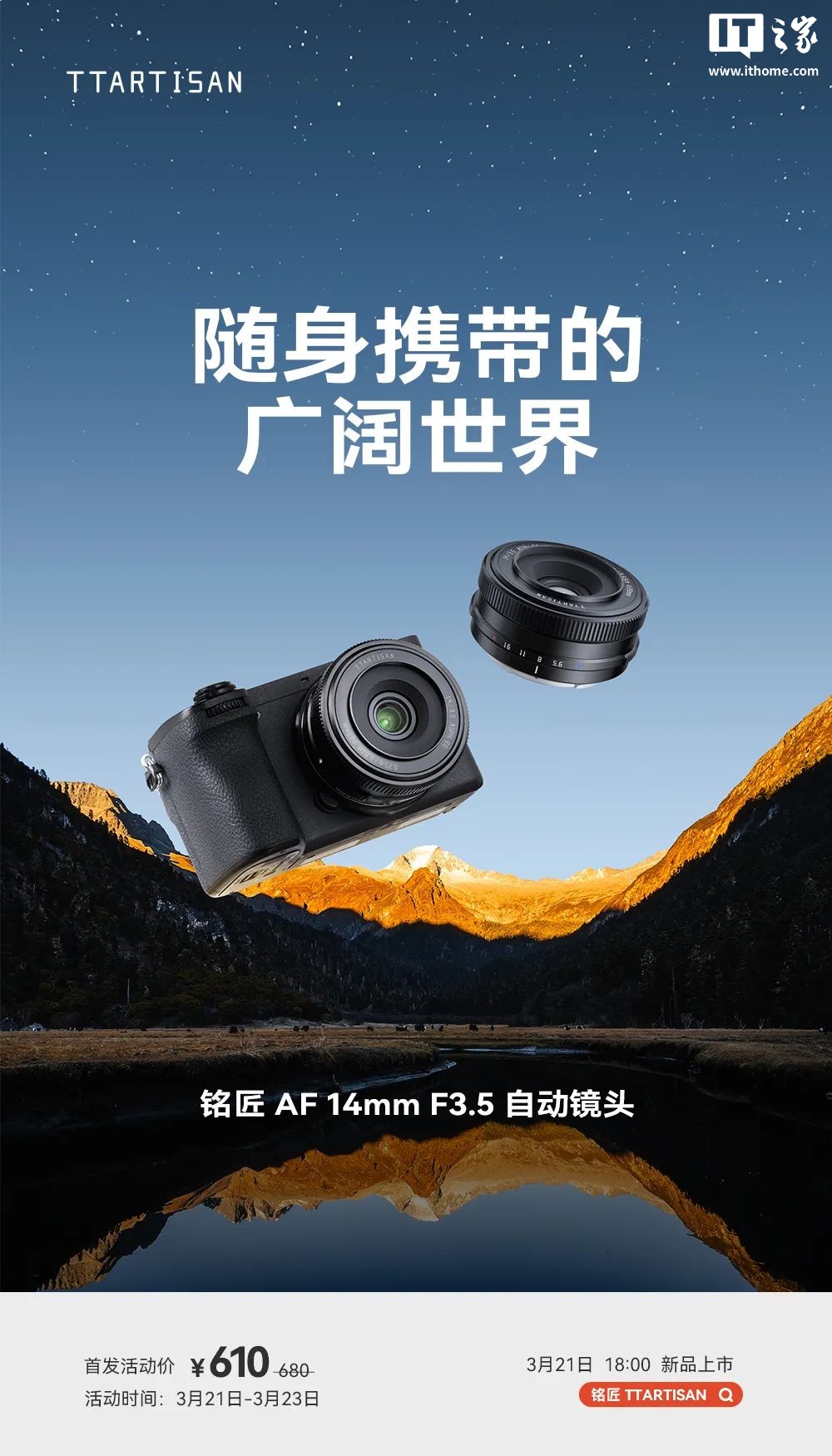 IT之家 3 月 21 日消息,铭匠光学今日发布了 AF 14mm F3.5 自动镜头,定价 680 元,首发活动价 610 元,今日 18:00 上市。