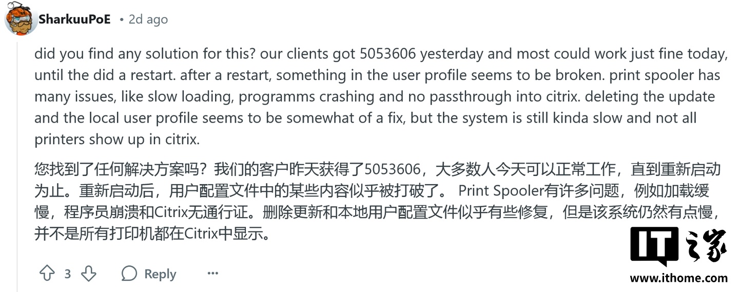 随后有网友跟帖表示:“我的一位客户昨天安装了 KB5053606 更新,在未重启前一切运转正常。在重启后 Printer Spooler 服务就出现加载缓慢、程序崩溃、无法通过 Citrix 进行传输等诸多问题”。