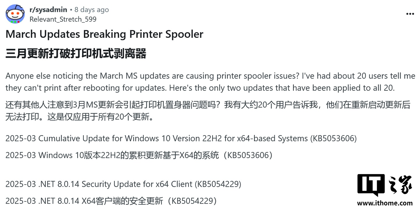 一位用户在 Reddit 社区反馈,3 月更新导致 Printer Spooler 服务故障,其服务的 20 多名客户均反馈无法启动打印服务。