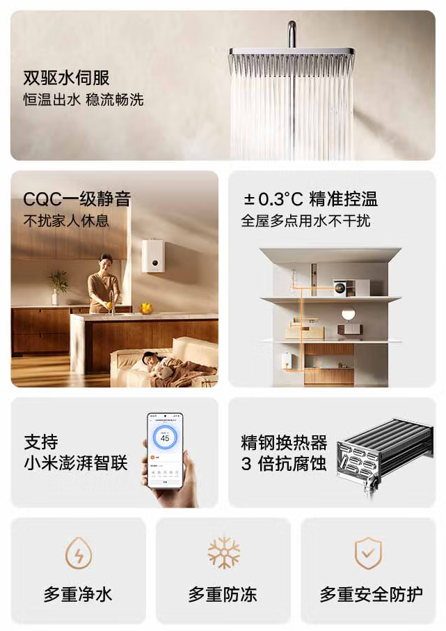 此外,新品升级精钢换热器,广泛运用于高端大型冷炉,抗腐蚀性能是铜换热器的 3 倍。智能化方面,新品支持米家多设备互联,通过米家 App 设定用水场景,定制沐浴模式,满足不同人群用水习惯和需求。