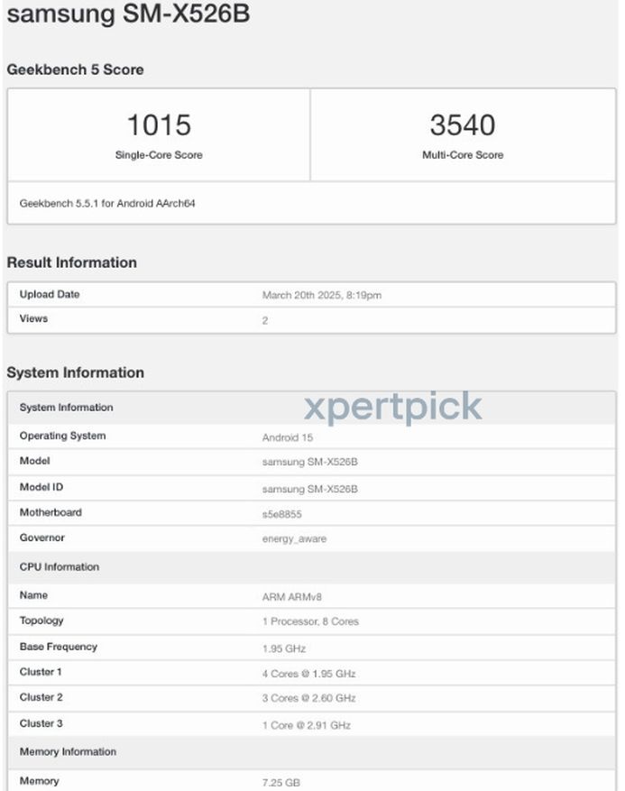 根据跑分库页面显示,该平板搭载 Exynos 1580 芯片组,采用 4nm 工艺,包含 1 个 2.91GHz 主核、3 个 2.60GHz 性能核和 4 个 1.95GHz 效率核,配备 Xclipse 540 GPU。