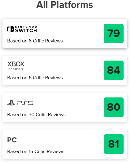 截止到目前,M 站 PS5 版均分 80(30 家评测媒体)、PC 版均分 81(15 家)、Xbox Series X|S 版均分 84(6 篇)。