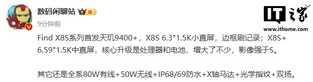 IT之家 3 月 21 日消息,OPPO Find X8S 系列手机将于下月发布,博主 @数码闲聊站 今日爆料称,该系列手机将首发天玑 9400+ 处理器。