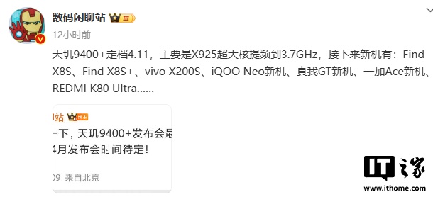 作为参考,天玑 9400 的 CPU 由一颗 3.626GHz 的 Cortex-X925 超大核、三颗 3.3GHz 的 Cortex-X4 大核以及四颗 2.4GHz 的 Cortex-A720 大核组成。该博主曾爆料称,天玑 9400+ 的 X925 超大核提频到 3.7GHz,接下来新机有: