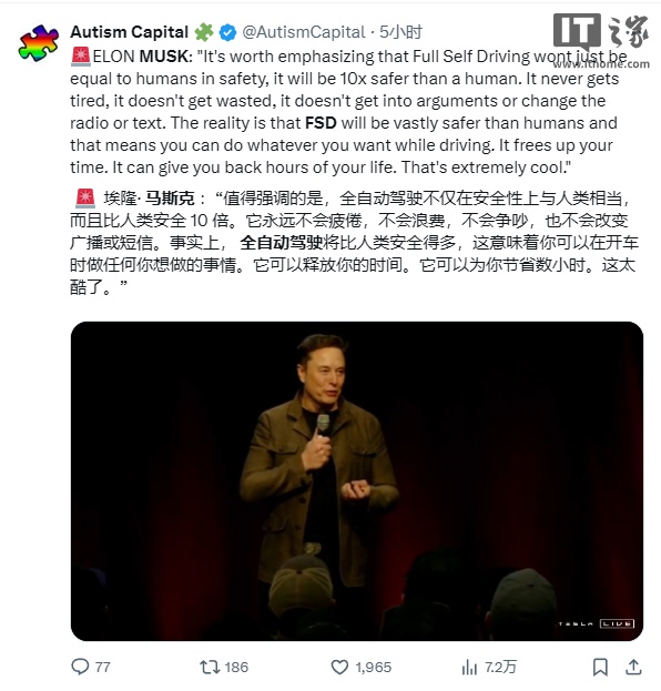 马斯克还表示,特斯拉的智能辅助驾驶系统在行驶过程中所需的干预越来越少,最终将完全无需人工干预,且行驶安全水平将超过人类驾驶,达到比人类安全 10 倍的水平。目前,在北美地区,特斯拉的智能辅助驾驶系统(北美称 FSD)已经能够实现从弗里蒙特工厂下线的车辆在无人驾驶情况下自行开往目的地停车场,等待装车长途运输。