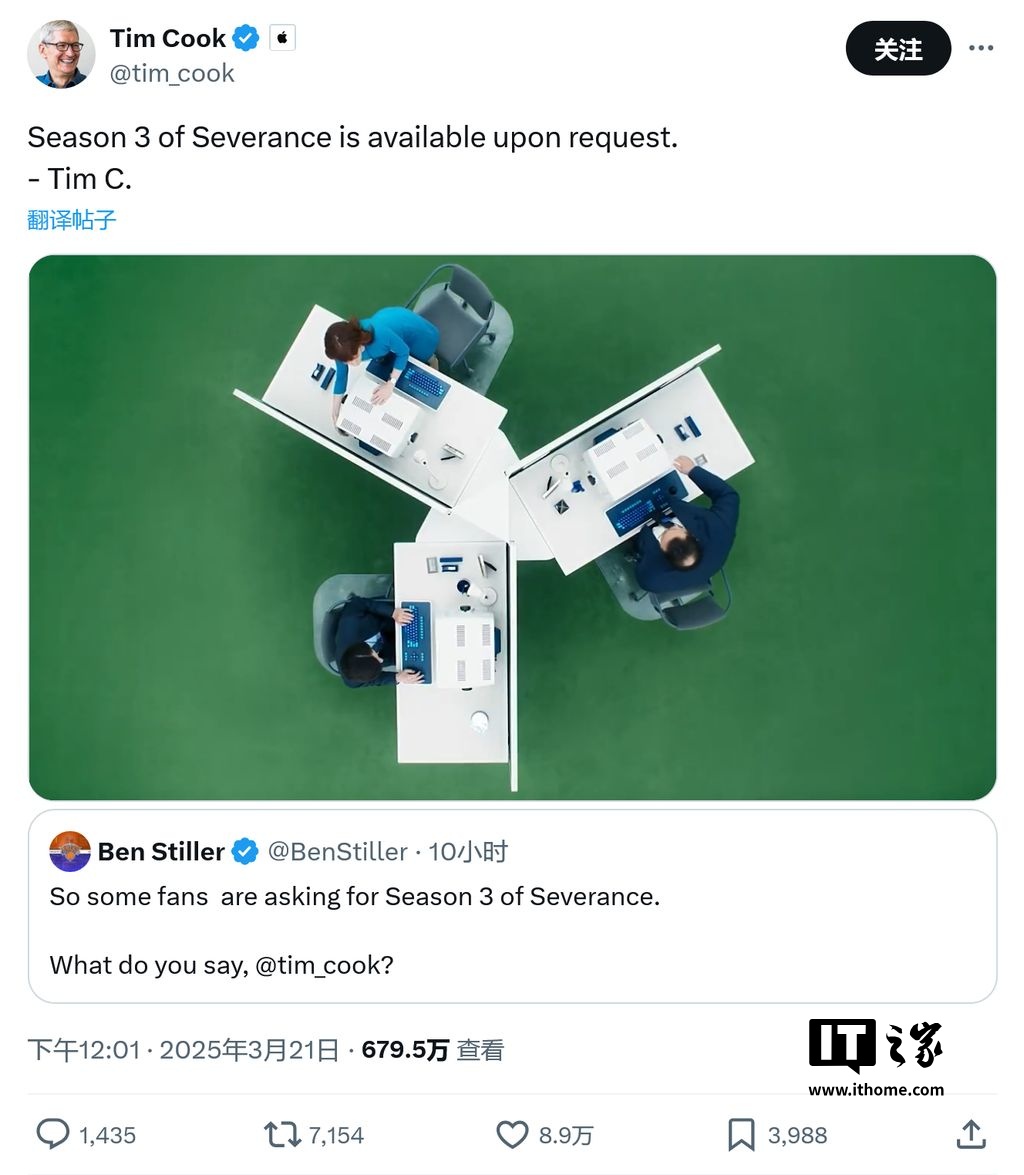 IT之家 3 月 22 日消息,苹果公司昨日(3 月 21 日)发布博文,宣布续订《人生切割术》第三季。该剧在 Apple TV + 上创下收视纪录,成为平台最受欢迎的系列之一,在第二季大结局发布后,粉丝们对第三季的期待值持续攀升。