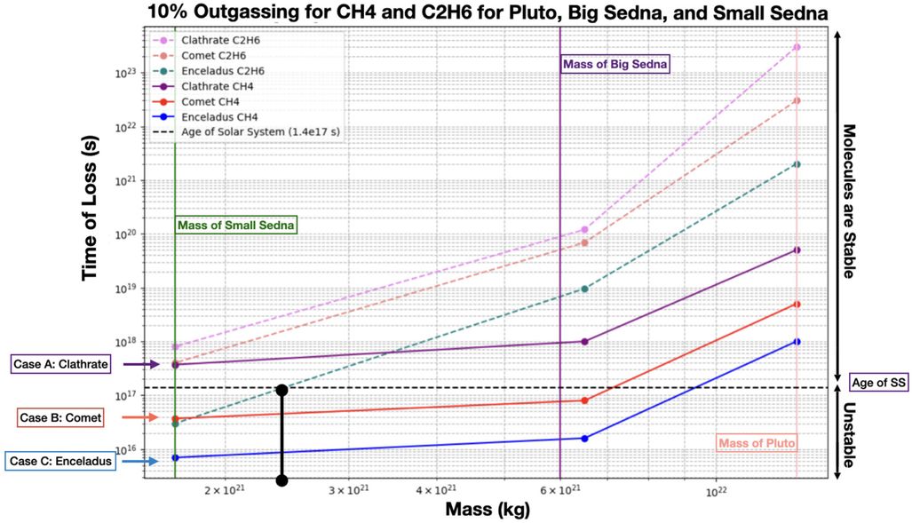 通过热逃逸(Jeans escape)和流体动力学逃逸(hydrodynamic escape)两种不同的逃逸模型,科学家发现甲烷在冥王星上保持稳定,但在塞德娜上逃逸。