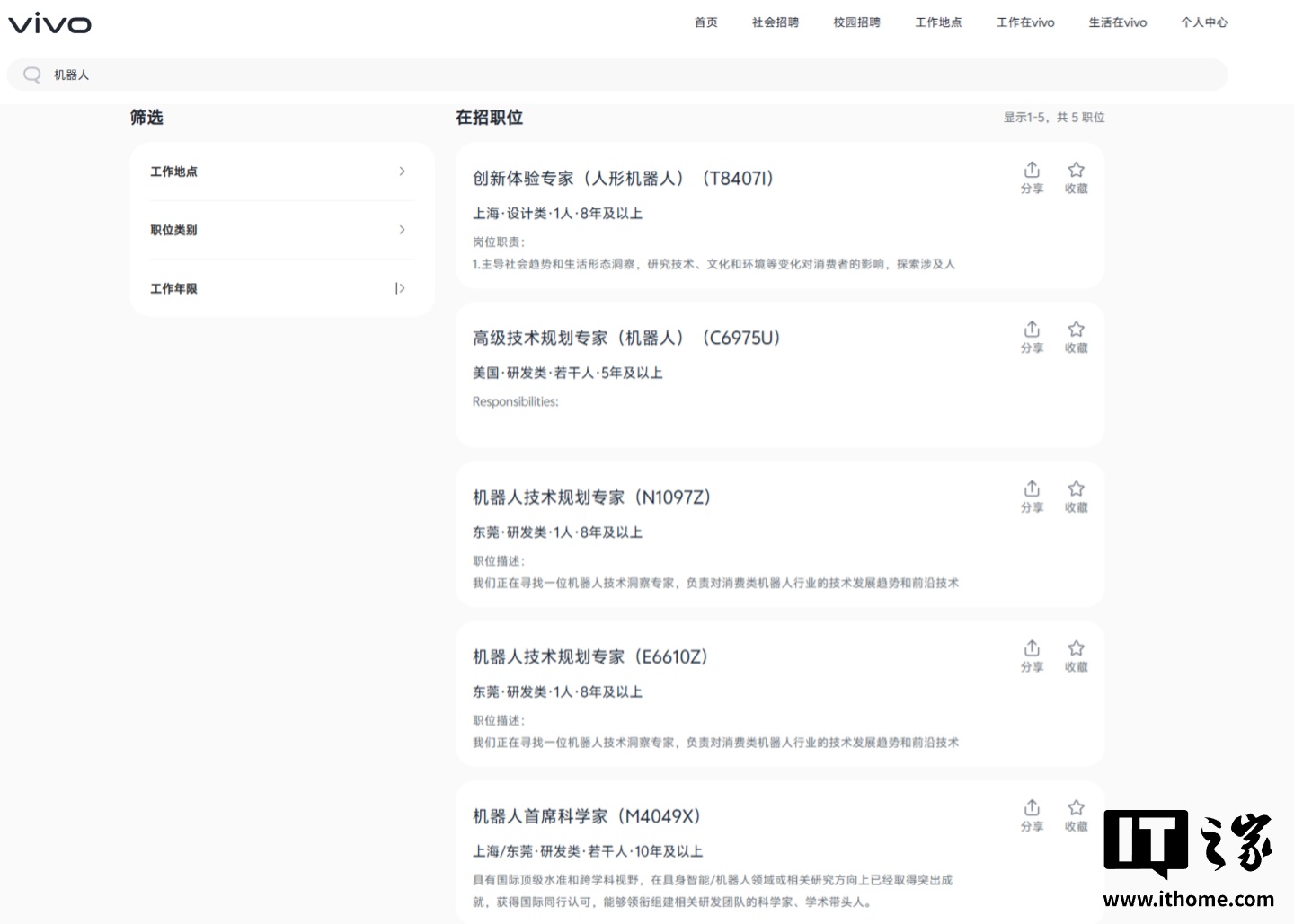 IT之家注意到,目前 vivo 已开始招聘机器人相关领域的技术专家,工作地点包括上海、东莞、美国等地,猎聘显示最高年薪超 120 万元。