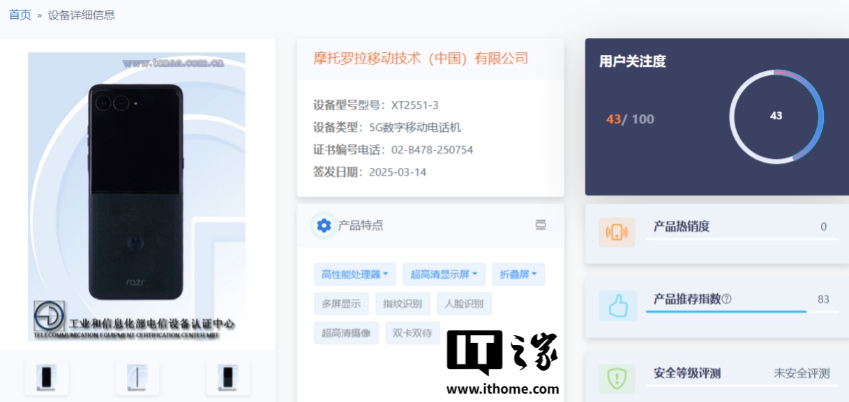 IT之家 3 月 23 日消息,型号为“XT2551-3”的摩托罗拉 moto 手机已现身电信设备终端网,新机证件照已公布,支持 5G 、指纹识别、人脸识别、双卡双待等功能。