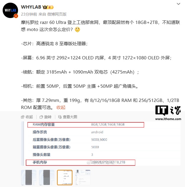 据博主 @WHYLAB 消息,该机为摩托罗拉 moto razr 60 Ultra,顶配规格为 18GB+2TB,主要配置信息如下: