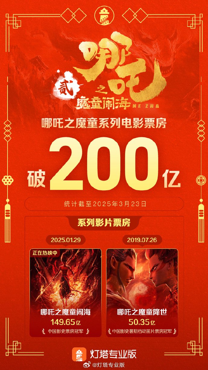 IT之家 3 月 23 日消息,据灯塔专业版数据,截至 3 月 23 日,《哪吒之魔童闹海》实时票房超 149.65 亿,哪吒之魔童系列电影内地累计总票房突破 200 亿,成为中国影史首个仅 2 部影片就破 200 亿的系列电影。此外,饺子导演内地票房成绩超 200 亿元(2 部电影),位列导演票房榜第一。