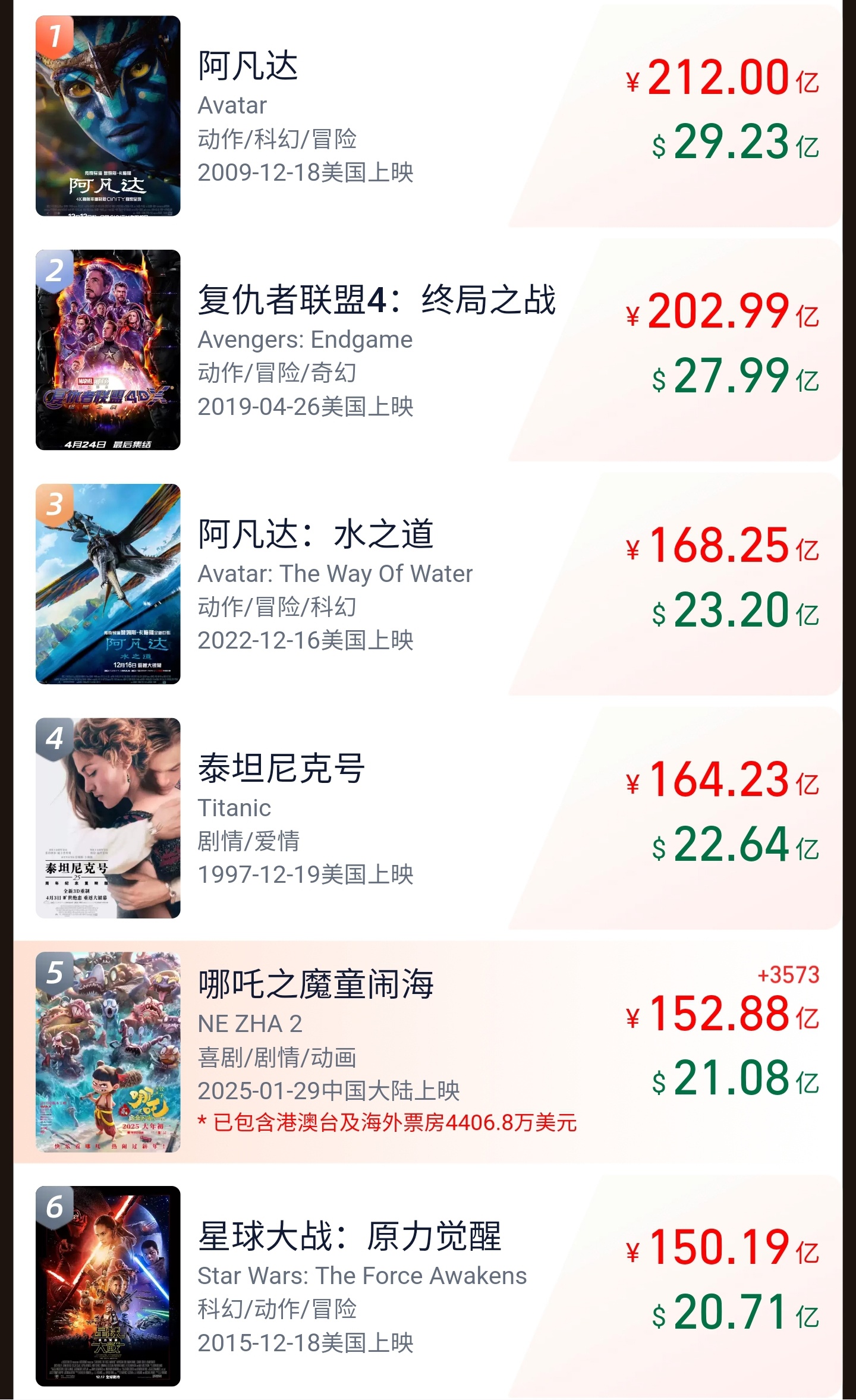 截至IT之家发文,《哪吒之魔童闹海》全球总票房达到 152.88 亿元,暂列全球影史第五,距离第四位的《泰坦尼克号》还有不到 12 亿的差距。这部动画电影的上映时间已经延长上映至 4 月 30 日,此前曾在 2 月 19 日宣布延长上映至 3 月 30 日。