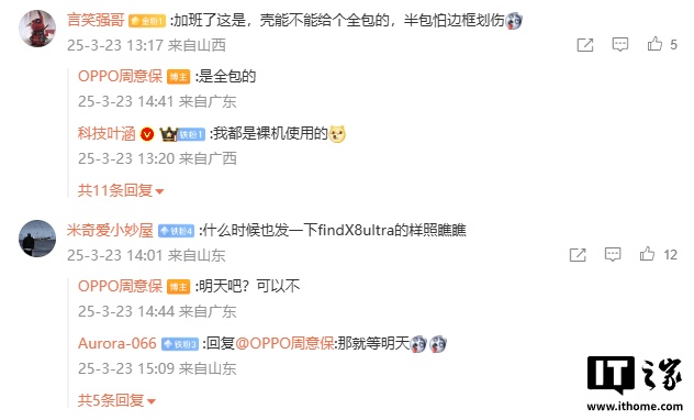 周意保还在评论区回复了部分网友的问题:针对手机壳是否为全包设计,他回复“是全包的”;针对新机价格是否人人都买得起,他表示“相信大部分朋友应该都是买得起的,这次有三款产品供大家选择”;针对手机壳挂绳是否为赠品,他称“这个绳子和这个保护壳是绑定一起的”。