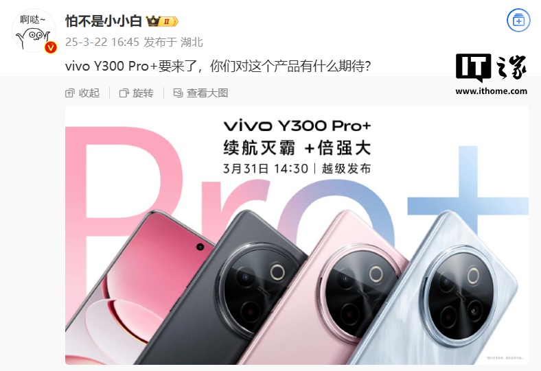 IT之家 3 月 24 日消息,vivo Y300 Pro+ 手机已在网络上曝光,相关信息显示,新机将于 3 月 31 日 14:30 发布。