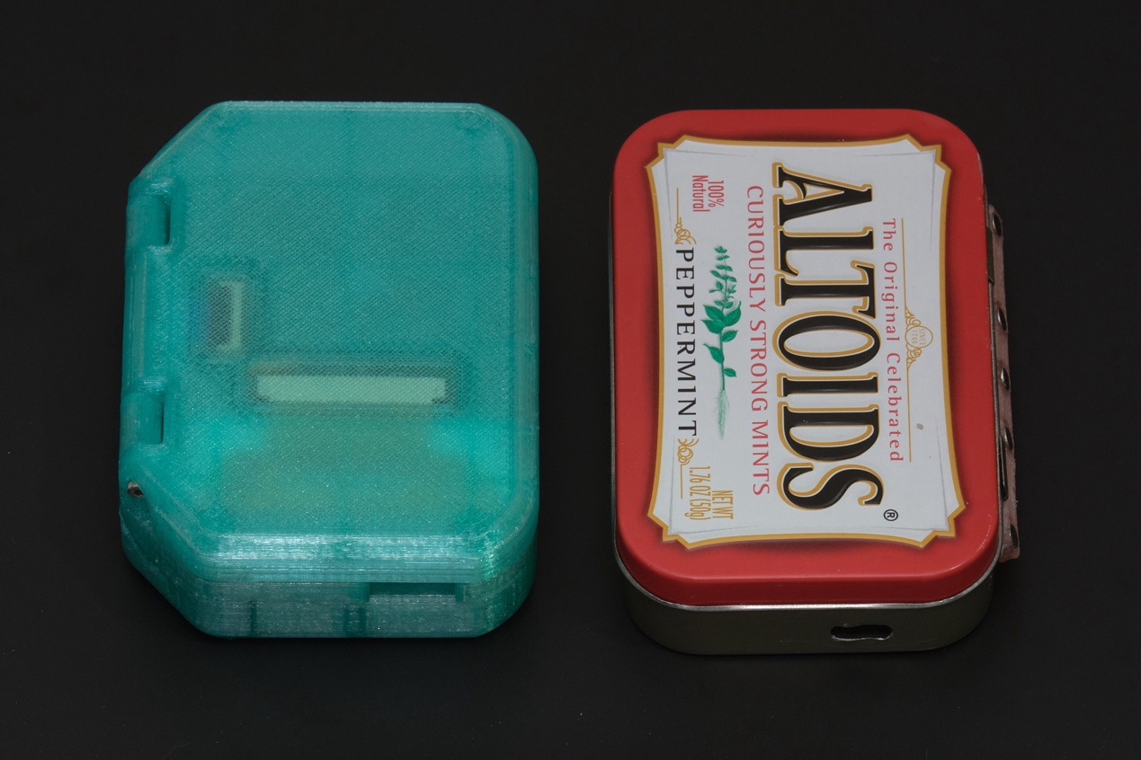 这款掌机可以采用 3D 打印的外壳,也可以用自行打孔后的薄荷糖包装盒,但官方称使用薄荷糖包装盒会让电池容量比 3D 打印外壳小 40%,同时人体工学设计会更差,官方称“强烈建议使用 3D 打印的外壳”。