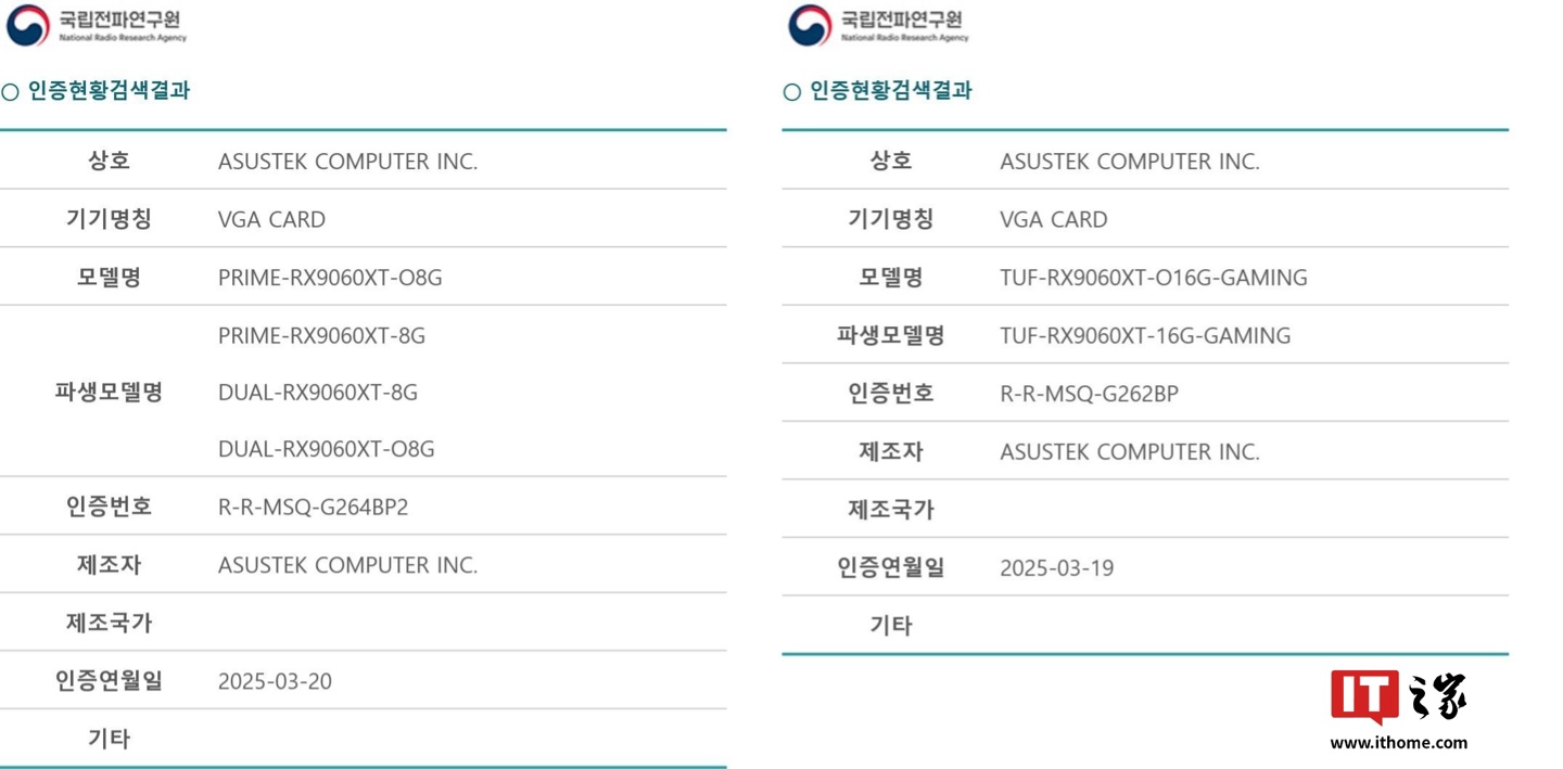 IT之家 3 月 24 日消息,消息人士 포시포시 (@harukaze5719) 北京时间 22 日在 X 平台表示,华硕本月早些时候向韩国 RRA 注册了多款 AMD Radeon RX 9060 XT 系列显卡,包含 8GB 和 16GB 两种显存容量的款式。