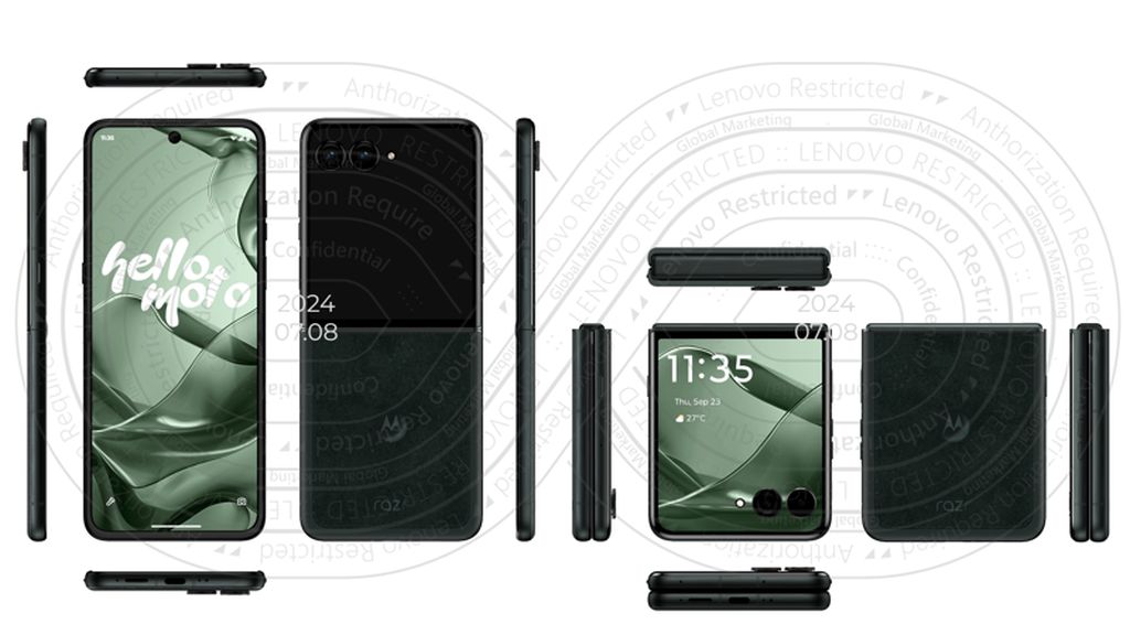 从 WPC 曝光的渲染图中可以看到,Razr 60 Ultra 延续了前代的设计语言,平坦的背面,配备副屏和双摄像头单元,圆润的边框,右侧为音量键和集成指纹识别的电源键;左侧为操作按钮和卡槽,底部为 USB Type-C 接口和扬声器。