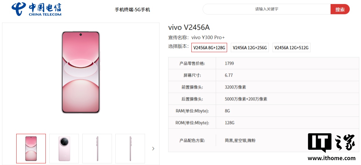 IT之家注意到,vivo Y300 Pro+ 手机已现身中国电信终端产品库,新机共有三种规格,建议零售价 1799 元起。