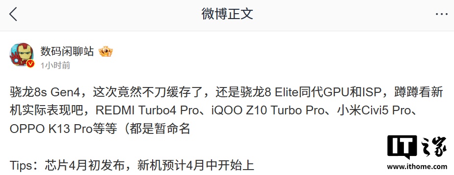 博主 @数码闲聊站 今日发文称,骁龙 8s Gen4 处理器是骁龙 8 Elite 同代 GPU 和 ISP,搭载该处理器的新机包括 REDMI Turbo4 Pro、iQOO Z10 Turbo Pro、小米 Civi 5 Pro、OPPO K13 Pro 等(暂定名,具体机型命名以官方为准)。