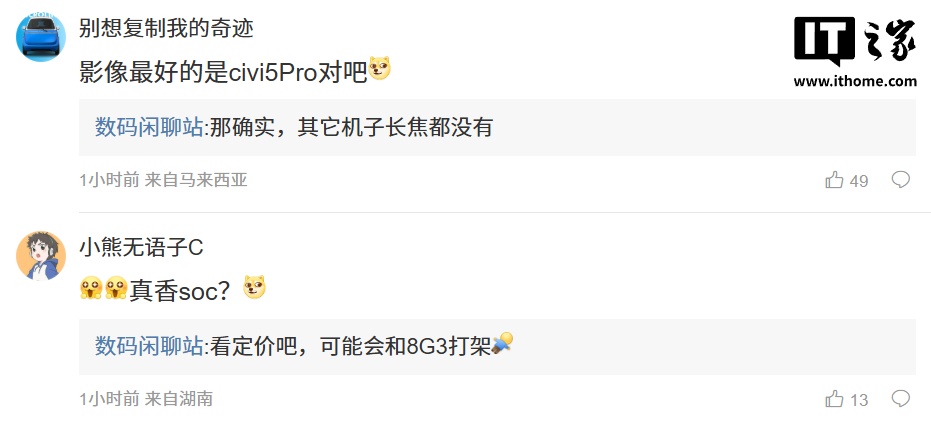 IT之家注意到,博主还在微博评论区回复了部分网友的问题:针对新机影像最好的是否为 Civi 5 Pro,博主回复“那确实,其它机子长焦都没有”;针对骁龙 8s Gen4 是否为“真香 Soc”,博主称“看定价吧,可能会和 8G3 打架”。