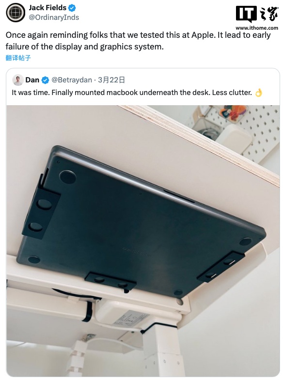 IT之家 3 月 25 日消息,产品设计师 Dan 上周于 X 上分享了一张他将 Macbook Pro 固定在桌子下的图片,随后苹果前工程师 Jack Fields 转发了他的图片并附文称需要留意细节,否则可能导致显示屏和图形系统过早受损。