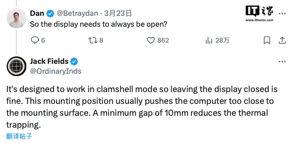 Dan 表示他将 MacBook 固定在桌子下时,留了一个 20 毫米的间隙,但他称在图里看不太出来,随后这名工程师回复称“太棒了”。