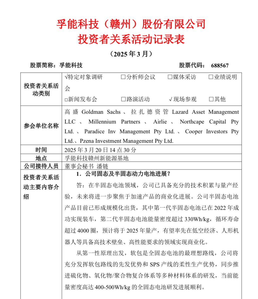 在人形机器人领域,孚能科技已与国内头部人形机器人企业对接固态电池相关需求,并根据客户需求进行了定制化开发,目前进展顺利,预计将在 2025 年内送样。