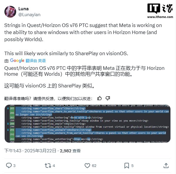 IT之家注意到,一位热衷于 VR 设备的爱好者 Luna 在 X 平台上分享了其对 Horizon OS 代码的深入分析。Luna 在该系统 76 版本的代码中发现了一段类似提示文本的字符串,其中提及了一项“共享”能力,能够“共享一个面板,以便世界中的其他用户可以看到它”,同时还有一个相对应的“取消共享”字符串。
