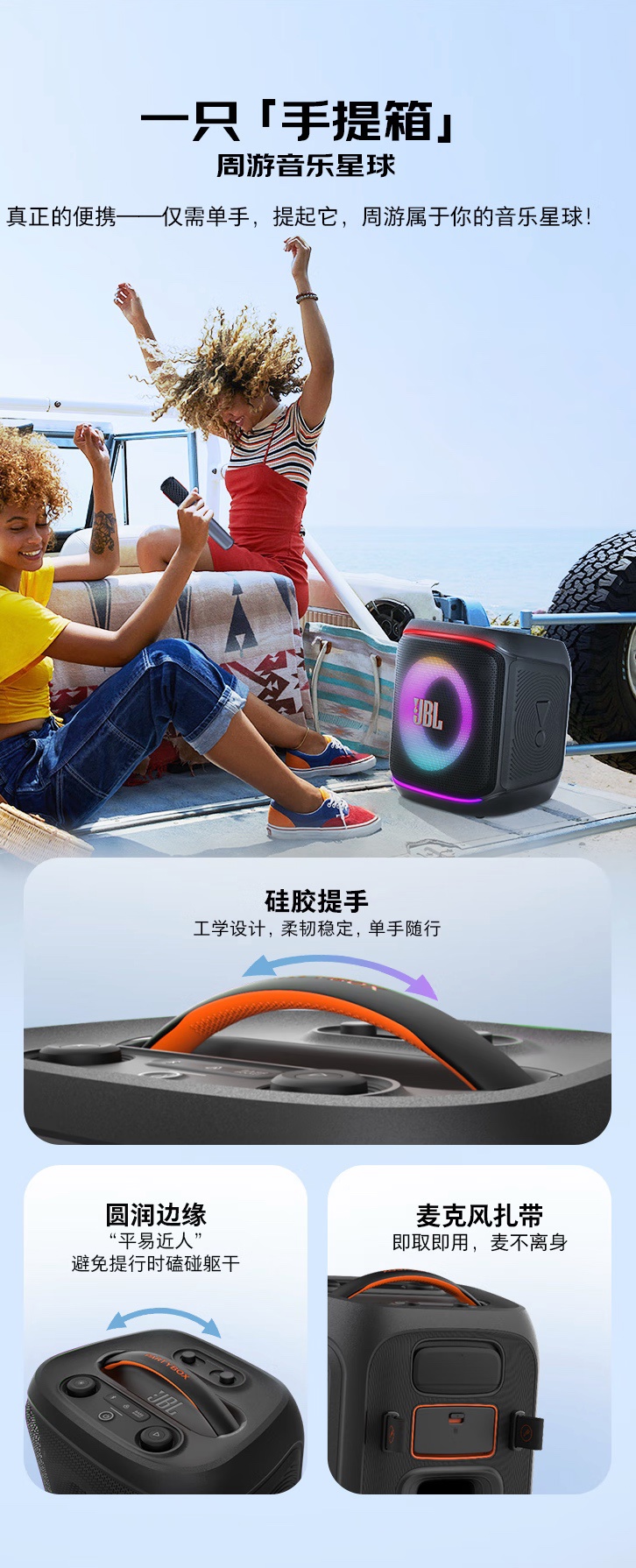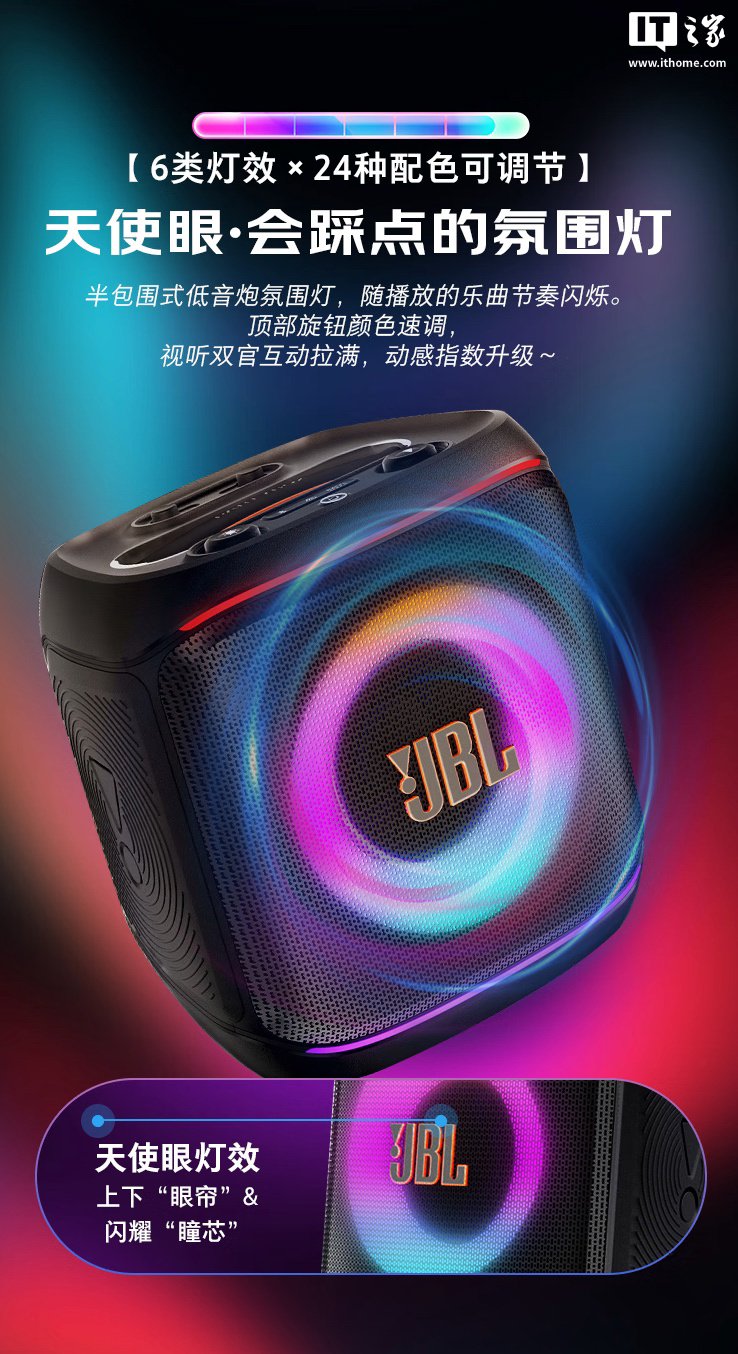 外观方面,这款音箱拥有 24 色可调节拍灯,支持根据歌曲匹配灯效,增加动感效果。音箱配备硅胶提手,号称“单手即可拎起”。