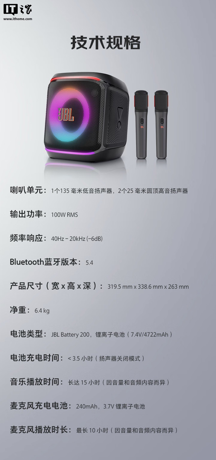 该音箱拥有 100W RMS 峰值功率,支持 Bass Boost 低频增强技术,同时还支持 DSP 低音量动态均衡技术。音箱内置 JBL 派对音效,同时可匹配 JBL 麦克风实现开机自联一键 K 歌功能。