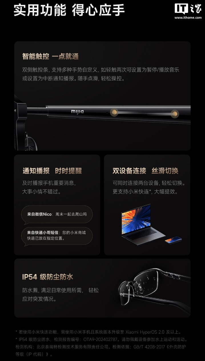 IT之家附 MIJIA 智能音频眼镜 2 亮点、产品参数信息如下: