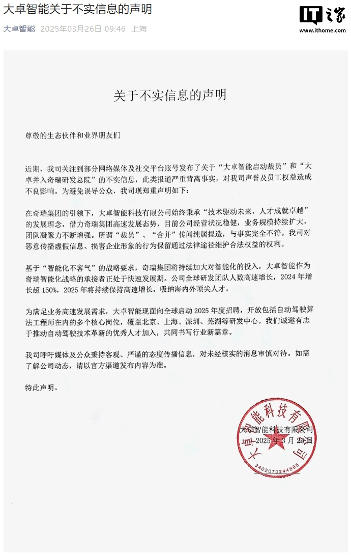 IT之家 3 月 26 日消息,今日奇瑞集团旗下大卓智能发布声明称,公司关注到部分网络媒体及社交平台账号发布了关于“大卓智能启动裁员”和“大卓并入奇瑞研发总院”的不实信息,此类报道严重背离事实。