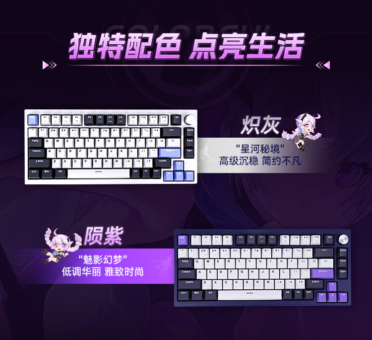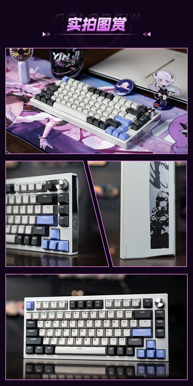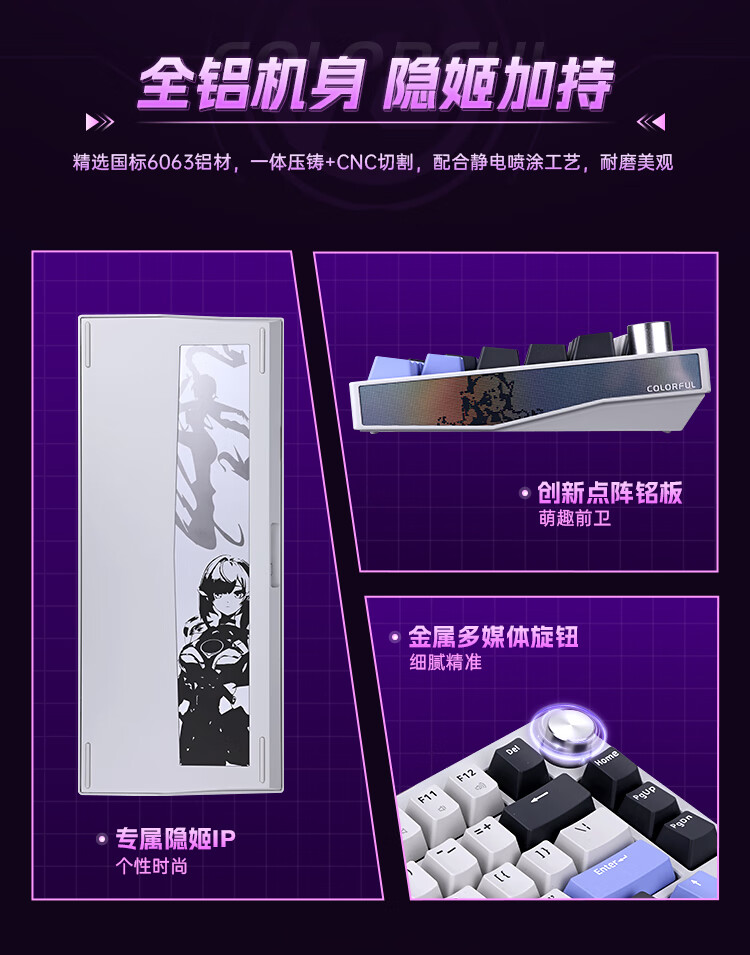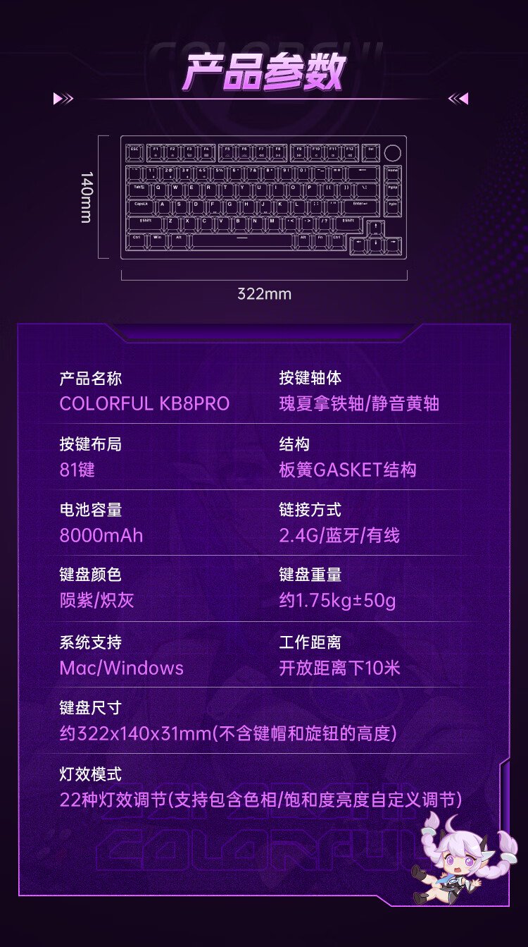 这款键盘采用了 CNC 全铝机身、GASKET 结构、8000mAh 电池,具备隐姬形象喷涂、多媒体旋钮、螺丝固定卫星轴,支持 22 种 RGB 灯效、全键无冲、热插拨,2.4G 延迟 1.2ms,还支持蓝牙和有线连接。IT之家附参数详情如下: