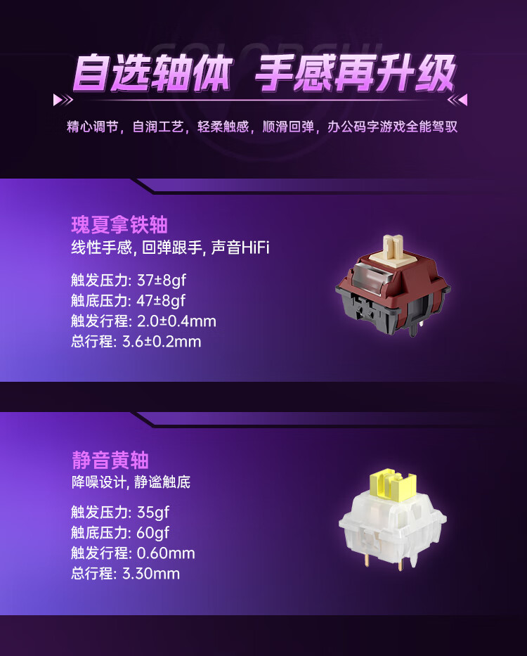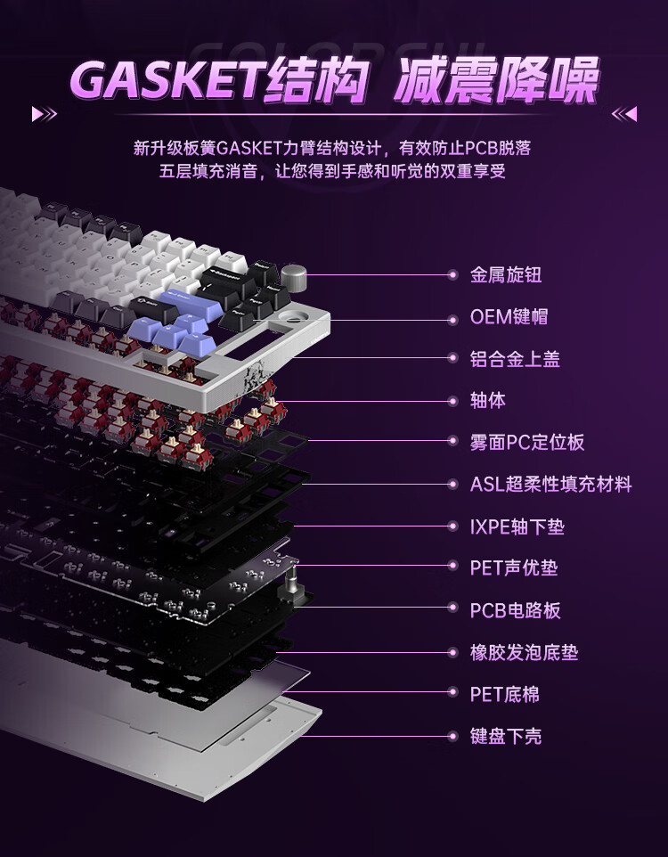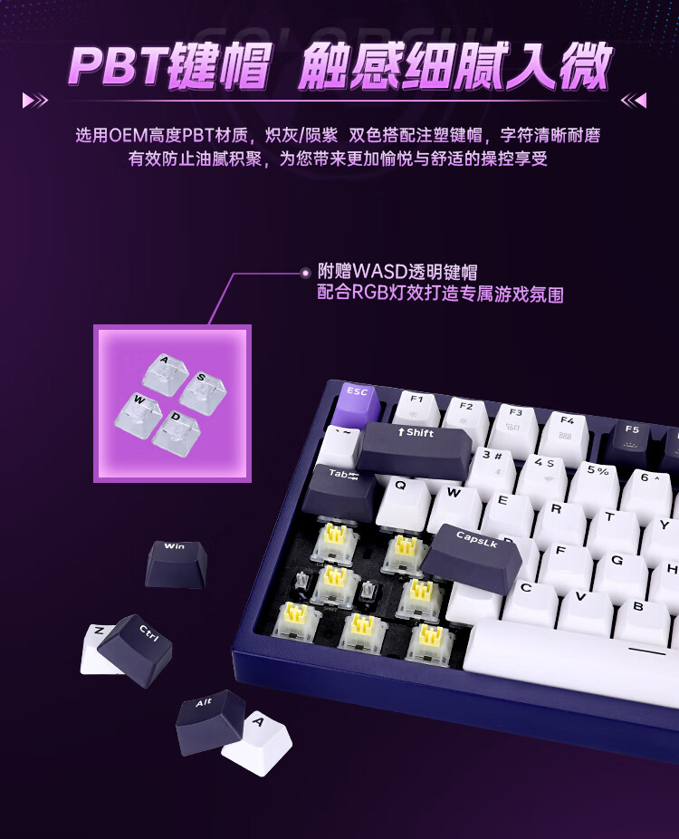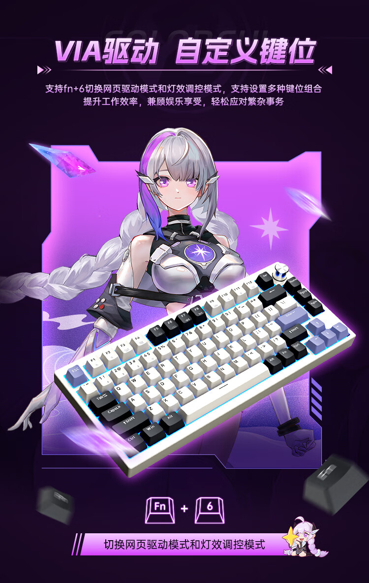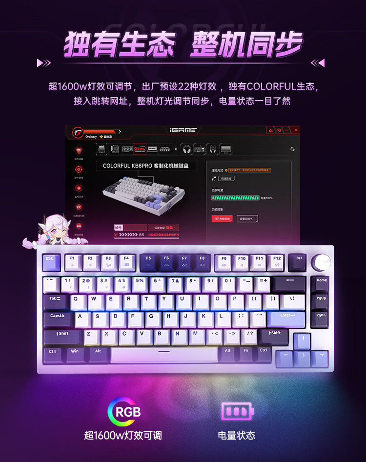 这款键盘采用了 CNC 全铝机身、GASKET 结构、8000mAh 电池,具备隐姬形象喷涂、多媒体旋钮、螺丝固定卫星轴,支持 22 种 RGB 灯效、全键无冲、热插拨,2.4G 延迟 1.2ms,还支持蓝牙和有线连接。IT之家附参数详情如下: