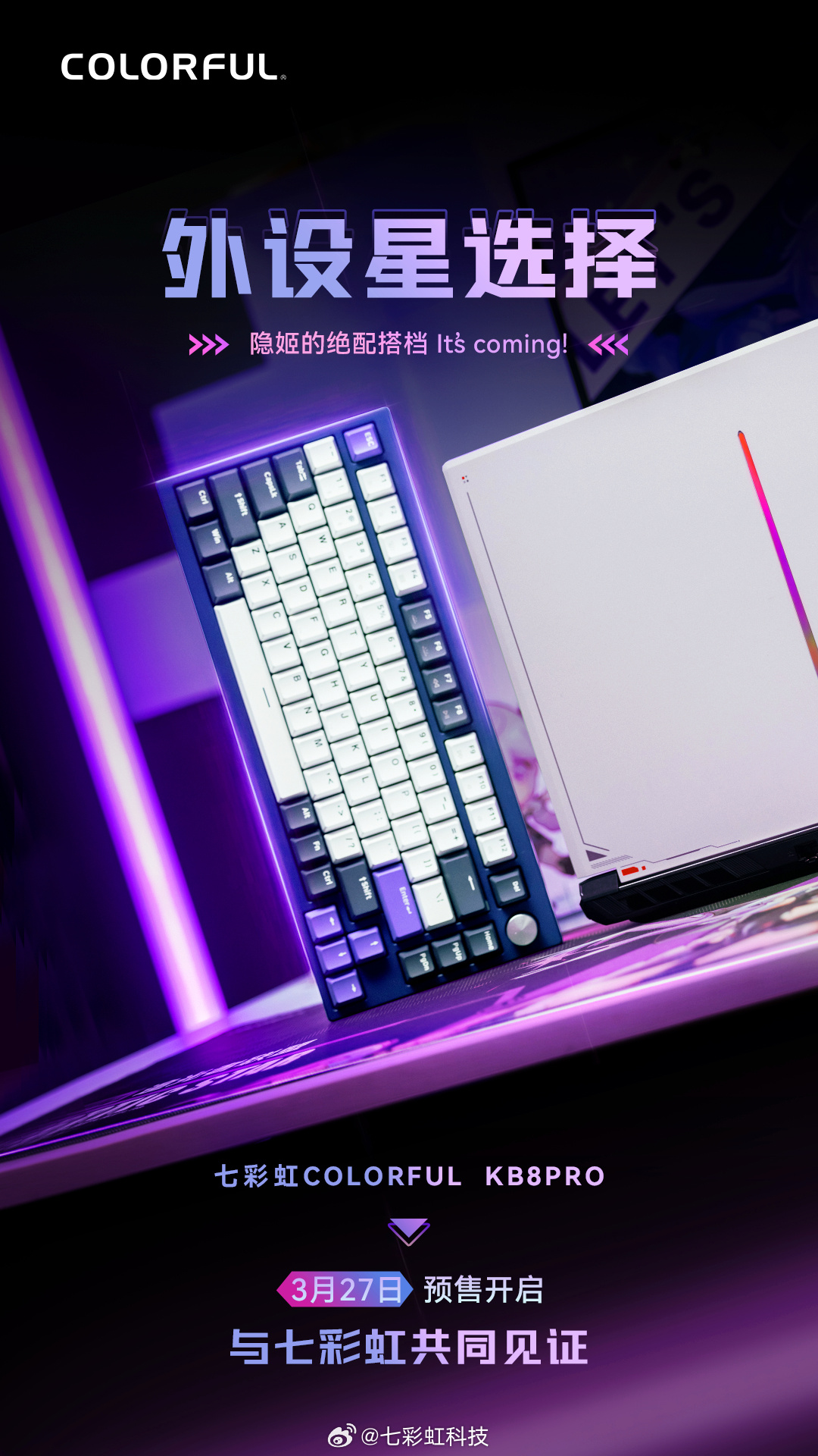 IT之家 3 月 26 日消息,七彩虹科技今天推出了一款 81 键的 COLORFUL KB8PRO 隐星三模客制化机械键盘,京东显示为 599 元,提供“瑰夏拿铁轴”“静音黄轴”两种可选,3 月 31 日 21:00 开售。
