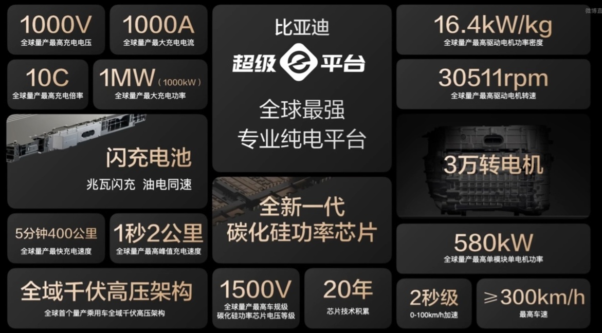 比亚迪还发布了“全球最强”专业纯电平台超级 e 平台,具备 3 万转电机、全域 1000V 高压架构、单电机功率 580kW、超过 300km/h 的最高车速。IT之家附该平台主要特性介绍图如下: