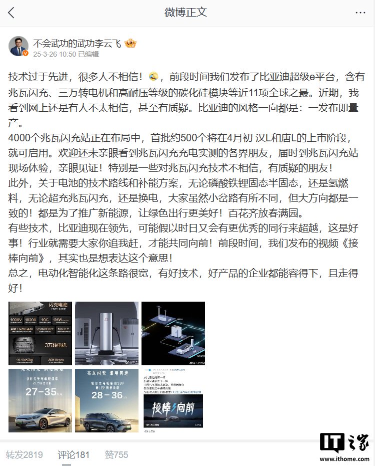 王传福还宣布,比亚迪将开放闪充站 / 桩有关技术,并喊话“欢迎大家一起来建”。